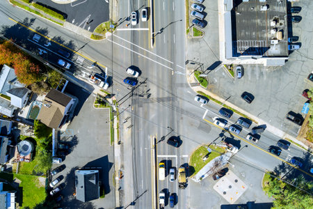 In small American town, an aerial view road with cars