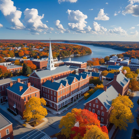 Plymouth historic town center aerial view on Main Street in fall, Plymouth, Massachusetts MA, USA.