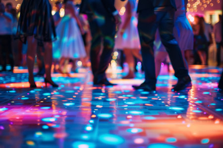 People dancing on illuminated dance floor. Festive event photography with copy space.