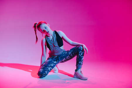 Young sportive girl dancing hip-hop in stylish clothes on colorful background at dance hall in neon light. Youth culture, movement, style and fashion, action.