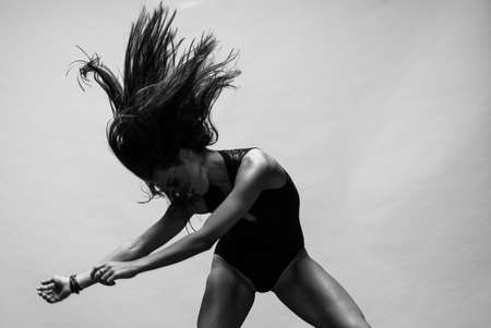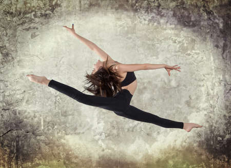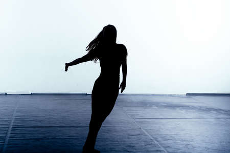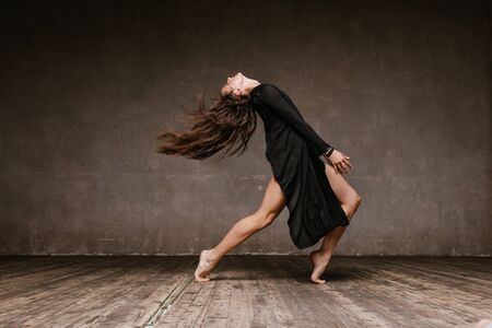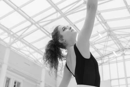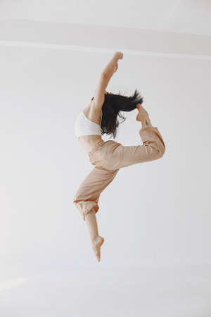 Young beautiful dancer posing on a studio background. Woman dancer in the gym.