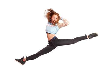 Modern dance style. Beautiful young girl practicing hip-hop on white background. Youth culture. Concept of movement, active lifestyle, hobby, ad