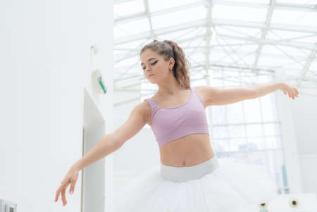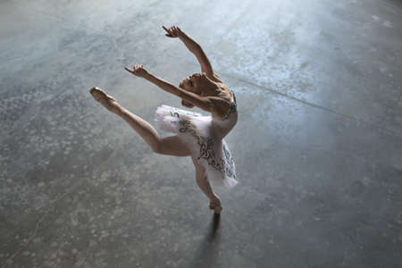 Pretty ballerina in a white tutu making a pose in a hall. She outstretches her hands and one leg up during tilting back. Daylight falls on her. Indoor. Horizontal.