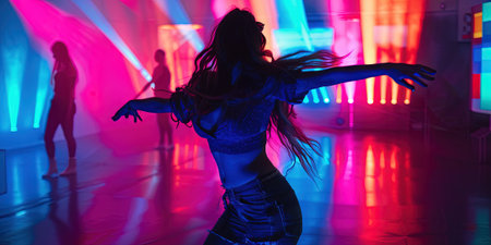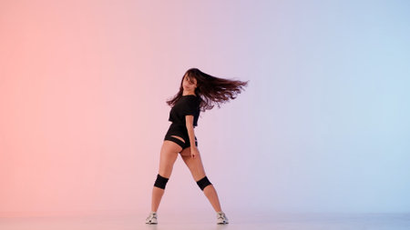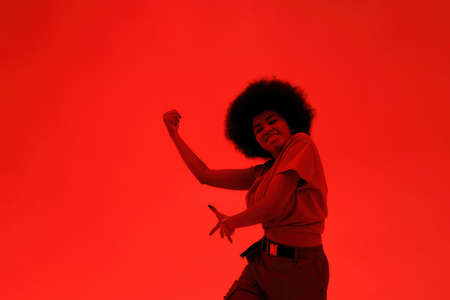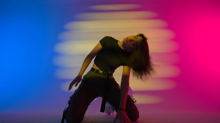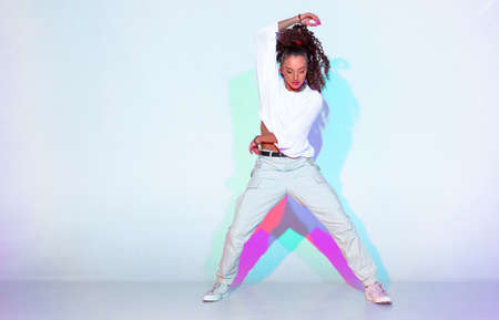 Dancing mixed race young girl in colourful studio light. Stylish female dancer performer show hip hop dance. Copy space