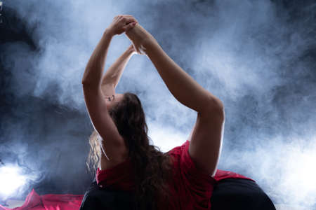 Contemporary dance artistry: female performer in fashionable outfit dancing through atmospheric haze