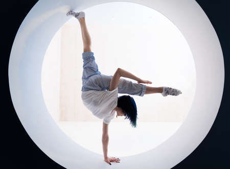 Flexible girl doing stretching and handstand in studio. concept of healthy lifestyle and yoga