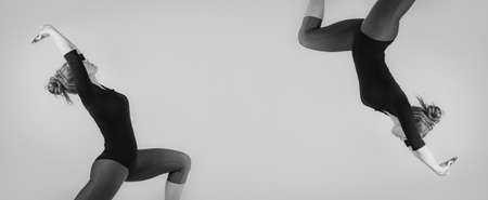 Attractive girl working out, dancing on grey background. Strength and motivation, sport and healthy lifestyle, keep fit. Creative layout, minimalistic design. Free space for text or logo, copy space.