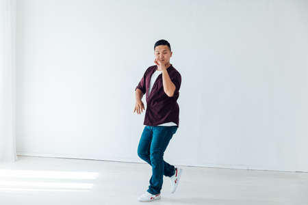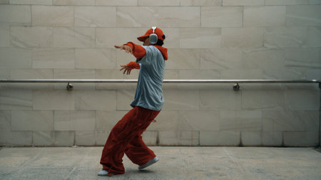 Handsome choreographer practice street dance in gray background. Young attractive b-boy dancer perform while wearing stylish cloth. Feeling of lively step. Copy space. Outdoor sport 2024. Sprightly.