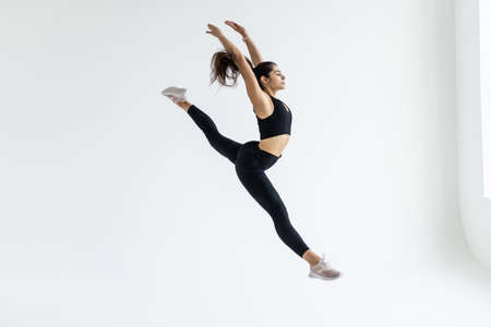 Asian young ballerina in swimsuit and leggings dancing against the big window during training in ballet school