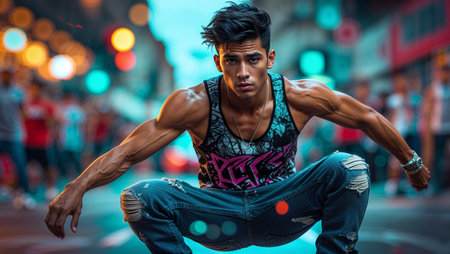 Young man showcases athleticism through a striking pose in an urban street setting at dusk