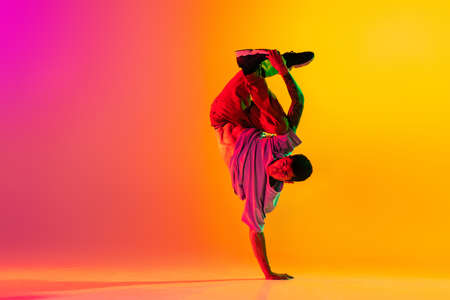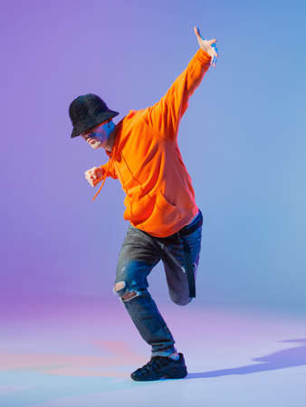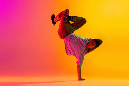 Beautiful sportive boy dancing hip-hop in stylish clothes on colorful gradient background at dance hall in neon light.