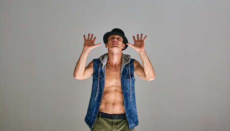 Young guy breakdancer in hat stand with hands up in studio isolated on gray background. Dance school poster