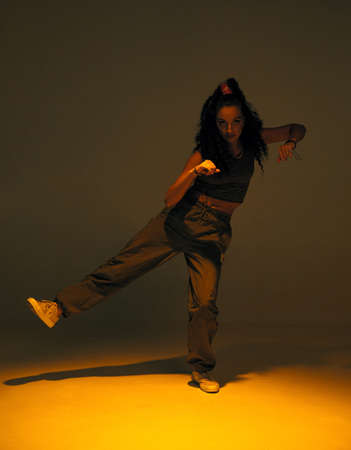 Dancing mixed race young girl in studio light. Female rap performer show expressive hip hop dance