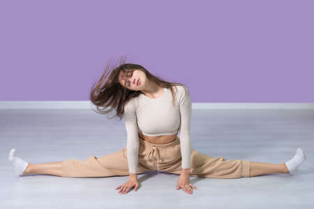 Young, beautiful, fitness woman is doing twine. Her hair is developing. The girl gives twine in the gym.