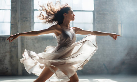 A ballet dancer gracefully spins in a sunlit room, her dress flowing as she moves. The scene captures the elegance and fluidity of her motion, emphasizing her skill and poise.