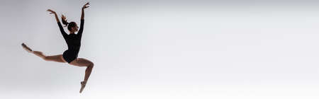 full length of flexible ballerina with raised hands jumping on grey, banner