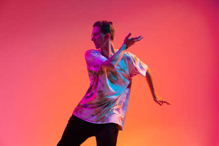 One energetic young man hip-hop dancer training isolated over gradient pink background in neon light