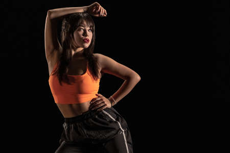 Dancing mixed race girl in studio spotlight. Female dancer performer show expressive hip hop dance