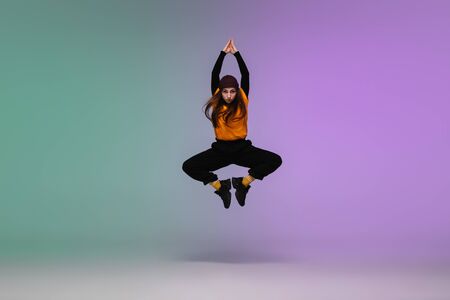 In jump. Beautiful girl dancing hip-hop in stylish clothes on colorful gradient background at dance hall in neon light. Youth culture, movement, style and fashion, action. Fashionable bright portrait.