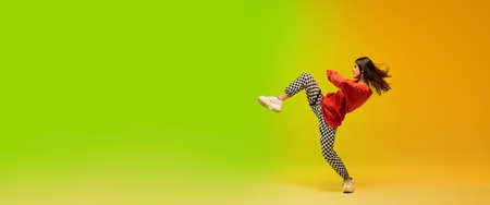 Flyer. Stylish sportive girl dancing hip-hop in stylish clothes on colorful background at dance hall in neon light. Youth culture, movement, style and fashion, action. Fashionable bright portrait.
