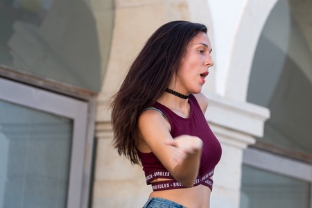 teenage woman dancing in the city outdoors, generation z trendy urban dance sport in blue jacket and glasses