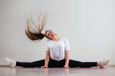 A young flexible fat woman sits in a transverse twine and waves her hair against a white background