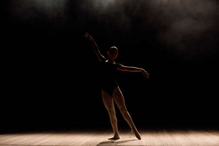 Cute little ballerina in dark ballet costume dancing on the stage. Kid in dance class. Child girl is studying ballet.