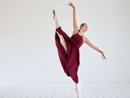 Athletic woman practising rhythmic gymnastics or ballet dance at white classroom alone