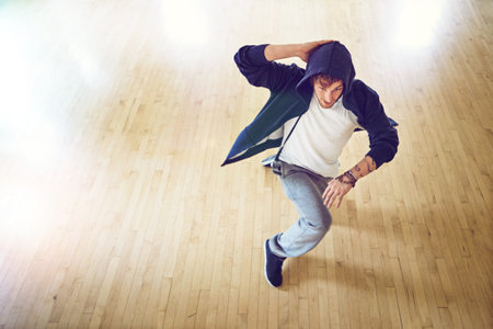 Breaking boundaries with his talent. High angle shot of a young man breakdancing in a studio.