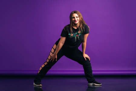 Plus size model in sportswear in studio, fat woman on purple background, body positive concept