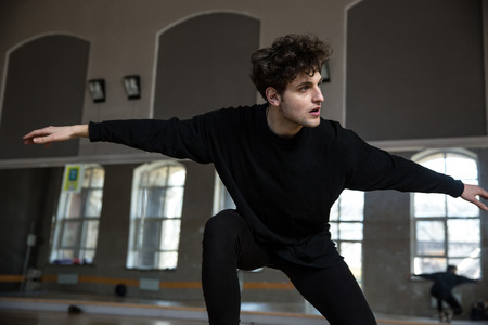 Young Man in a Jumper Dancing Contemporary Dance in Studio. Breakdancing. Dance School Poster. Copy Space. Battle competition announcement. Pink and Blue Background