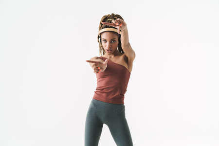 Healthy and Fitness concept - Portrait of young beautiful African American with her hands outstretched and closing eyes feeling relax. Isolated on white studio background.