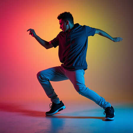 Dynamic Hip Hop Dancer Performing Under Vibrant Stage Lights in Front of Energized Crowd