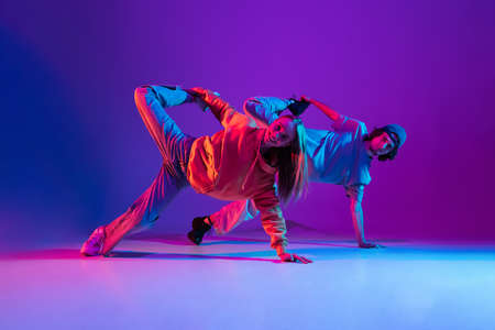 Young man and woman dancing hip-hop in casual sports youth clothes on gradient purple pink background at dance hall in neon light.