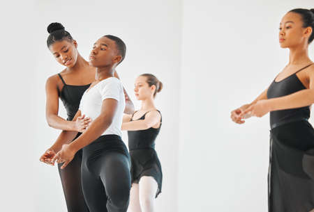 Give your talent room to grow. a young woman teaching a young boy ballet in a dance studio.