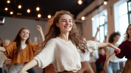 A joyful dance class in a spacious studio featuring young women dancing energetically during a lively session