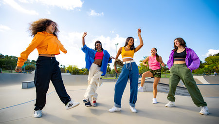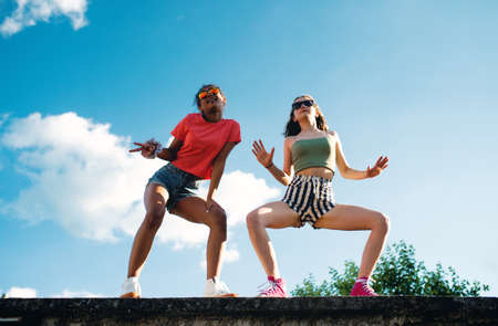 Group of young people dancing hip-hop outdoors. Group of friends having fun together.