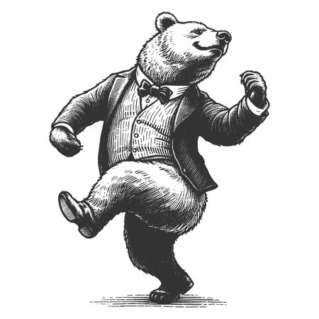 bear in a suit dancing, showcasing classic artistic style and whimsical charm sketch engraving generative ai fictional character vector illustration. Scratch board imitation. Black and white image.