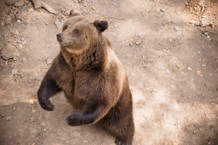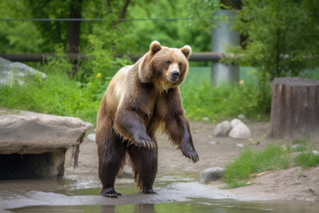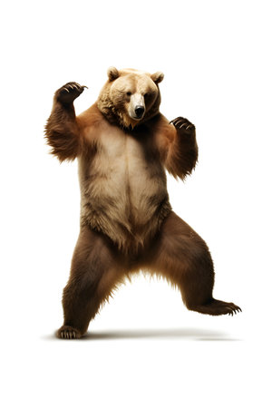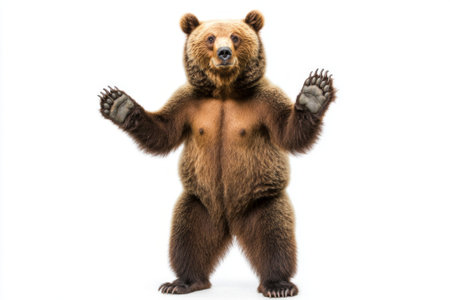grizzly bear rises on its hind legs, showcasing its impressive physique and large paws, exuding a sense of strength and majesty in a minimalist setting.