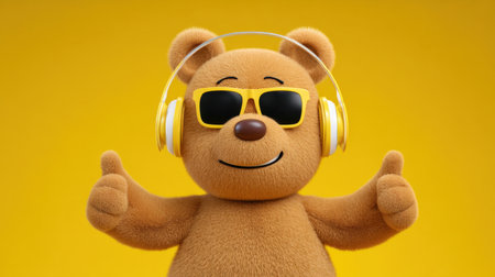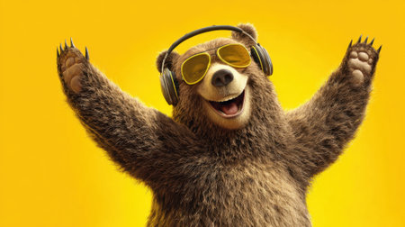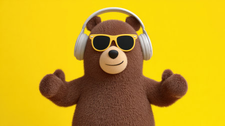 A cheerful cartoon bear with headphones and sunglasses stands against a bright yellow background. This playful illustration exudes joy and fun, perfect for various creative projects.