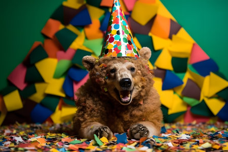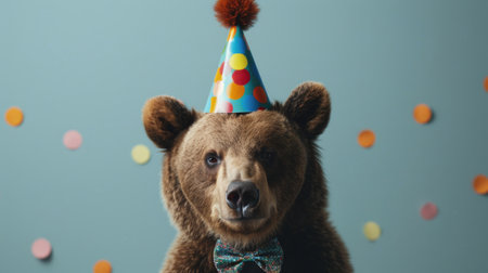 Studio portrait of cute bear in dress celebrating party, created with Generative AI technology