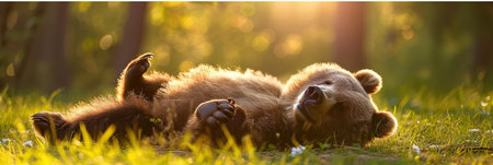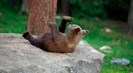 The bear cub lying on his back in the green grass. Close up portrait of Brown bear in the summer forest. Green forest natural background. Scientific name: Ursus arctos