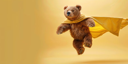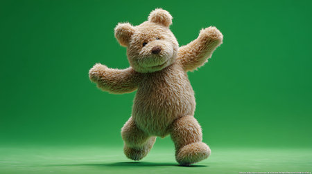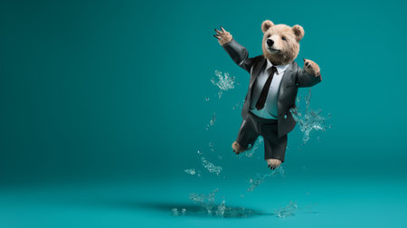 a teddy bear, in a hyper-realistic style, is captured mid-jump against a vibrant turquoise background. this commercial-style image showcases the bear's playful character and the attention to detail in its design. the minimalistic portrait highlights the bear's features, while the deconstructed tailoring adds a unique touch. shot with a fujifilm x100v, the image is high-resolution at 3840x2160 pixels. ai generated