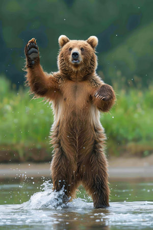 A brown bear, a carnivorous mammal with a large head and keen eyes, stands on hind legs with arms outstretched in a natural landscape