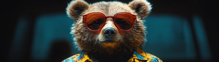 Bear in Hawaiian shirt with red sunglasses, studio lighting, neutral background