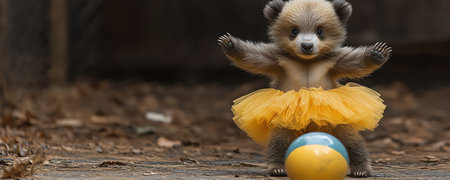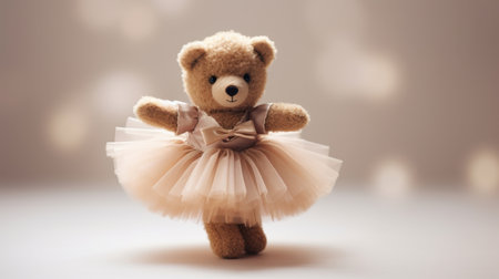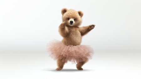 A charming small bear wearing a fluffy pink tutu dances joyfully on a bright white background. Its vibrant colors and playful pose capture the essence of childhood innocence and fun.