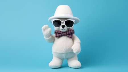 plush toy character a white bear in hat and sunglasses points with finger on yellow background. Generative AI illustration