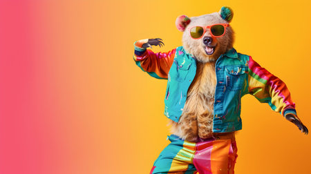 A cheerful and energetic bear character wearing a bright and colorful fashion outfit including sunglasses dancing with an expressive and lively movement on a vibrant random background