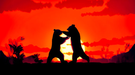 Couple of bears standing next to each other in front of sunset. Generative AI.