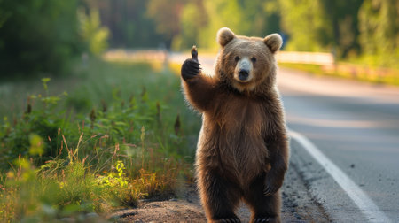 A brown bear is standing on a road and giving a thumbs up